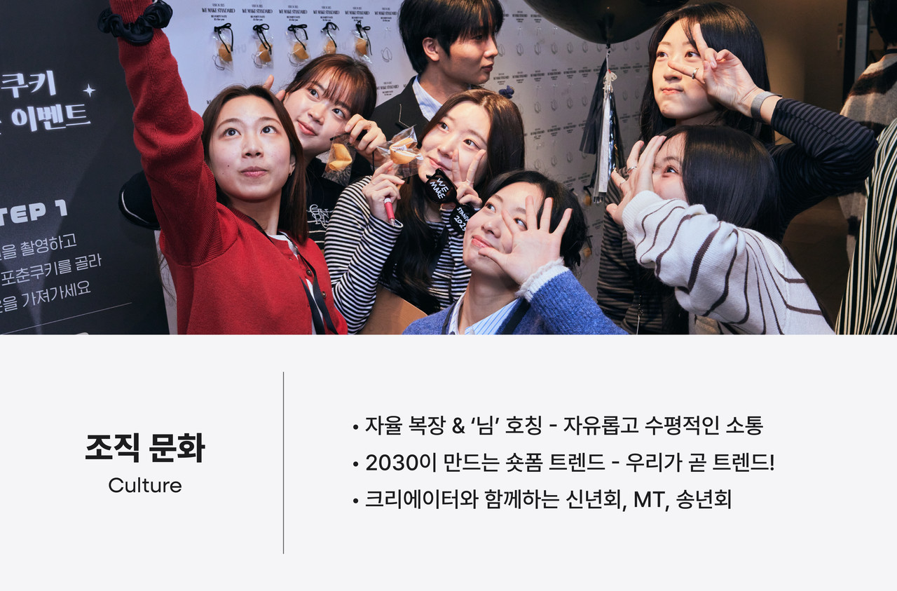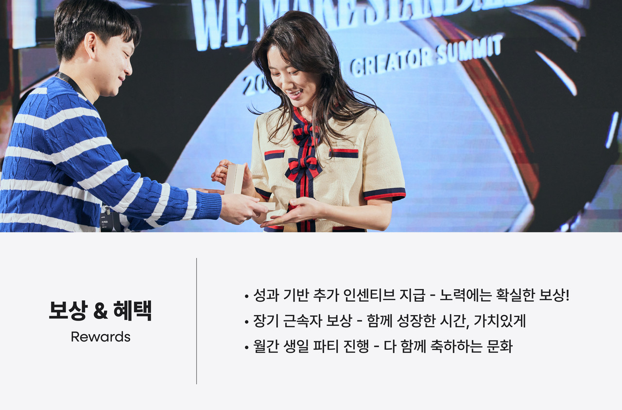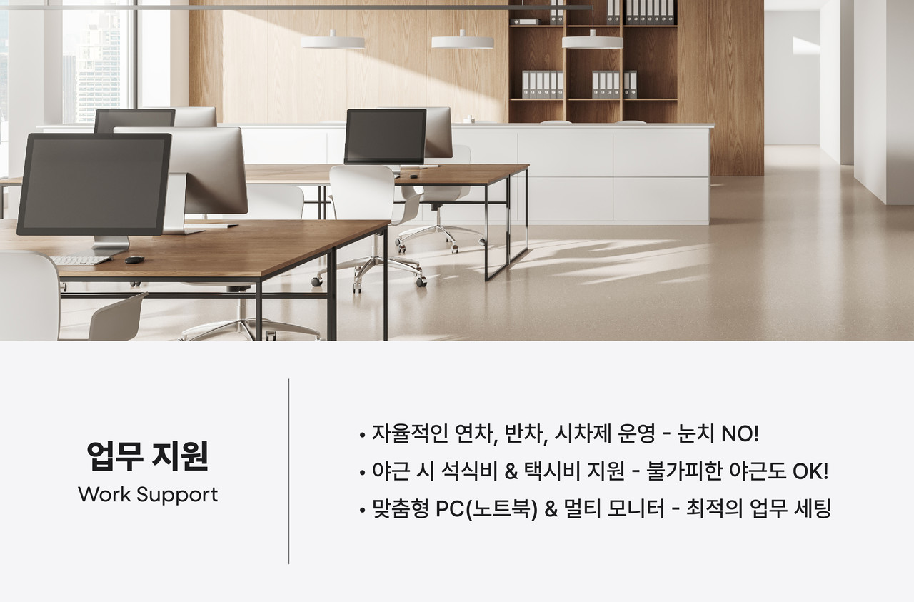 숏폼 시장은 빠르게 성장하고 있으며,우리는 변화하는 환경에 맞춰더 나은 업무 환경을 만들어가고 있습니다.다양한 복지를 통해 직원들이최고의 퍼포먼스를 낼 수 있도록 지원합니다.